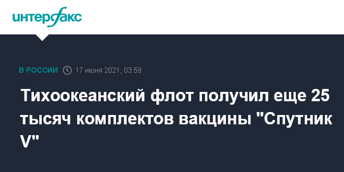 Москва. 17 июня. INTERFAX.RU - Госпиталь Тихоокеанского флота (ТОФ) во Владивостоке получил очередную партию вакцины от коронавируса: самолётом военно-транспортной авиации доставлено 25 тысяч комплектов препарата "Спутник V", сообщила в четверг пресс-служба ТОФ.