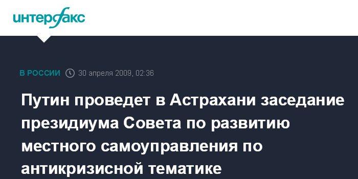 Путин проведет в Астрахани заседание президиума Совета по развитию местного самоуправления по антикризисной тематике