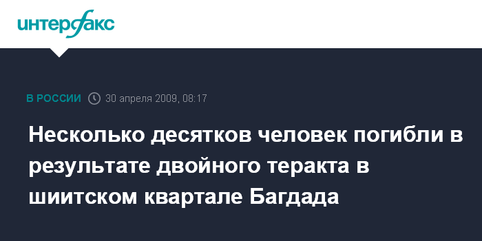 Москва. 30 апреля. INTERFAX.RU - Не менее 41 человека погибли в минувшую среду в результате подрыва двух автомашин в Багдаде, сообщил иранский англоязычный телеканал "Пресс ТВ" со ссылкой на представителей полиции в иракской столице.