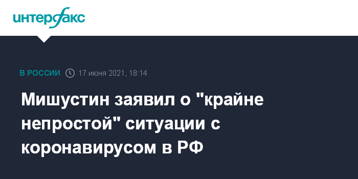 Москва. 17 июня. INTERFAX.RU - Ситуация с коронавирусом в России очень сложная, растет число заболевших, и появляются новые штаммы, чреватые серьезными осложнениями, заявил премьер РФ Михаил Мишустин.