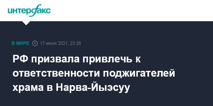 Москва. 17 июня. INTERFAX.RU - Генконсульство России в Нарве сожалеет об очередном поджоге православной церкви в городе Нарва-Йыэсуу и надеется на привлечении к ответственности преступника, сообщает МИД России в своем фейсбуке.