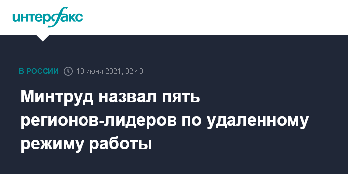 Москва. 18 июня. INTERFAX.RU - Министерство труда и социальной защиты РФ (Минтруд) обнародовало список регионов-лидеров по распространению удаленного режима занятости, в первую пятерку вошли Москва, Санкт-Петербург, Московская, Свердловская и Новосибирская области, сообщает в пятницу газета "Известия".