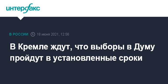 Москва. 18 июня. INTERFAX.RU - В Кремле считают, что парламентские выборы, намеченные на 19 сентября, пройдут в установленный срок, и будет использован имеющийся опыт голосования в условиях санитарных ограничений.