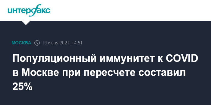 Москва. 18 июня. INTERFAX.RU - В Москве уровень популяционного иммунитета к COVID-19 при пересчете составил 25%, сообщил мэр столицы Сергей Собянин.