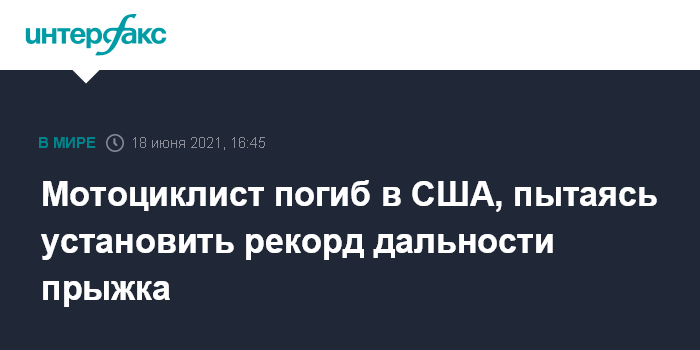 Москва. 18 июня. INTERFAX.RU - Каскадер погиб в штате Вашингтон, когда пытался установить мировой рекорд по дальности прыжка на мотоцикле.