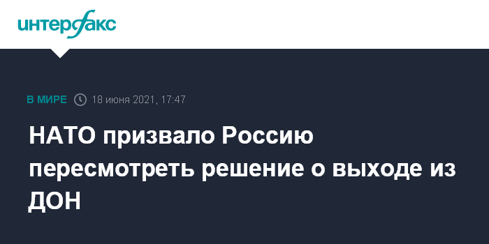 Москва. 18 июня. INTERFAX.RU - В НАТО сожалеют о решении Москвы о выходе из Договора по открытому небу (ДОН) и призывают власти РФ за шесть следующих месяцев, пока Россия остается стороной договора, пересмотреть этот шаг и вернуться к полному соблюдению ДОН, говорится в обнародованном в пятницу заявлении альянса.
