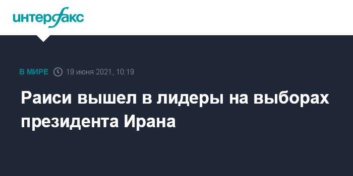 Москва. 19 июня. INTERFAX.RU - Кандидат в президенты Ирана Ибрахим Раиси с большим отрывом лидирует на выборах главы государства, и с победой его поздравили уже все его соперники, хотя подсчет голосов еще не завершен, передает агентство Mehr со ссылкой на результаты подсчета в МВД Ирана.