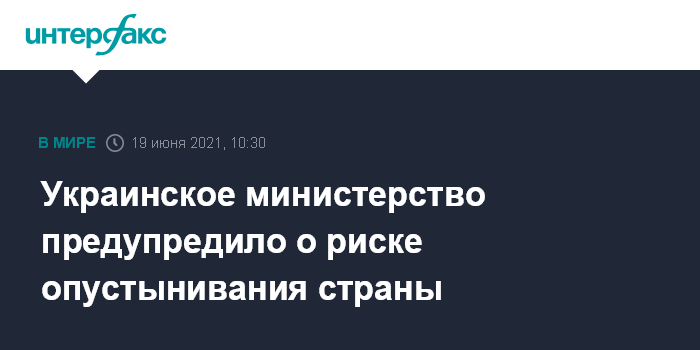Москва. 19 июня. INTERFAX.RU - Украина переходит в зону сверхвысоких температур и катаклизмов из-за погодных изменений, и уже в ближайшие 30-40 лет стране грозит опустынивание обширных территорий, сообщило Министерство защиты окружающей среды и природных ресурсов.