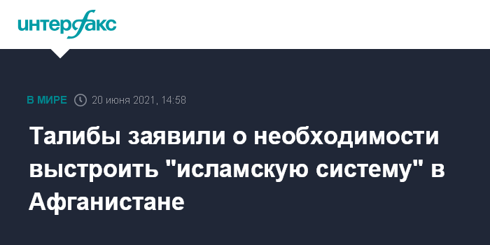 Москва. 20 июня. INTERFAX.RU - Движение "Талибан" (запрещено в РФ) заявило, что готово к мирному решению афганского конфликта на основе выстраивания системы, основанной на принципах ислама.