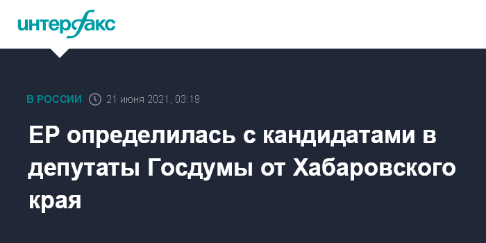 Москва. 21 июня. INTERFAX.RU - Партия "Единая Россия" определилась с кандидатами от Хабаровского края на выборах в Государственную думу РФ, сообщает в понедельник пресс-служба регионального отделения.