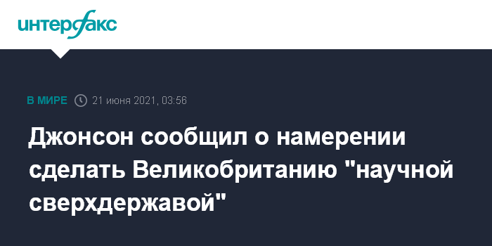 Москва. 21 июня. INTERFAX.RU - Премьер-министр Великобритании Борис Джонсон заявил, что правительство намерено вложить до 22 млрд фунтов стерлингов к 2025 году в исследования, и тем самым укрепить позиции Великобритании как научной сверхдержавы, сообщает BBC News.