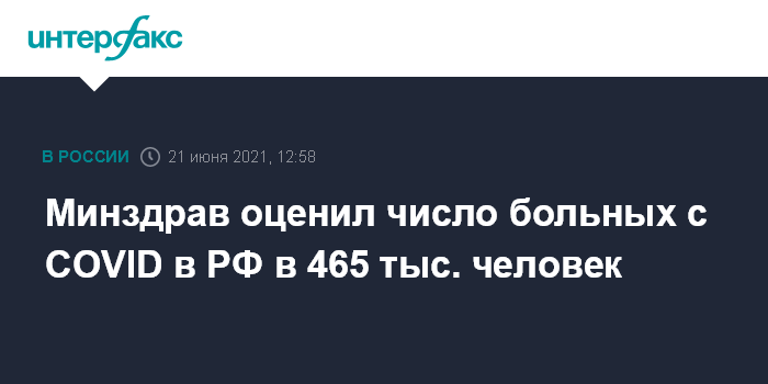 Москва. 21 июня. INTERFAX.RU - В России 465 тыс. человек в настоящее время болеют коронавирусом, сообщил министр здравоохранения Михаил Мурашко.