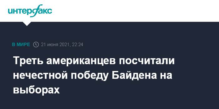 Москва. 21 июня. INTERFAX.RU - Каждый третий американец полагает, что Джо Байден одержал победу на выборах президента США в 2020 году благодаря мошенничеству с голосами, свидетельствуют результаты опроса Монмутского университета.