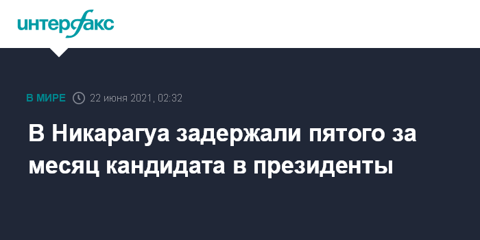 Москва. 22 июня. INTERFAX.RU - Национальная полиция Никарагуа задержала пятого кандидата в президенты страны за месяц, всего в последние недели там были задержаны 15 оппозиционных лидеров, сообщает CNN.