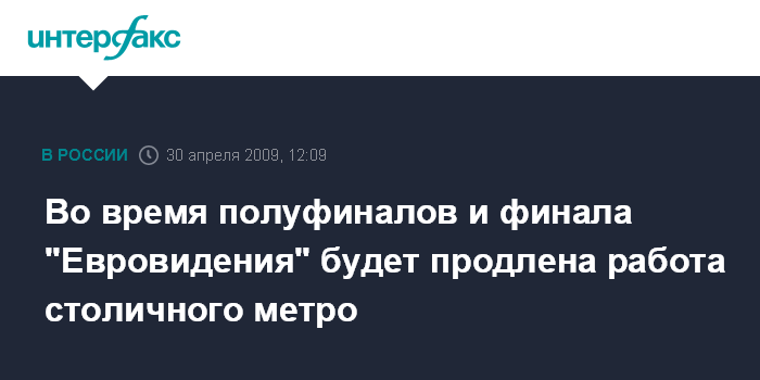 Москва. 30 апреля. INTERFAX.RU - Мэр столицы Юрий Лужков дал команду продлить время работы московского метро в период проведения полуфиналов и финала конкурса "Евровидение-2009", сообщил заместитель начальника ГУВД столицы Вячеслав Козлов на пресс-конференции в центральном офисе "Интерфакса" в четверг.