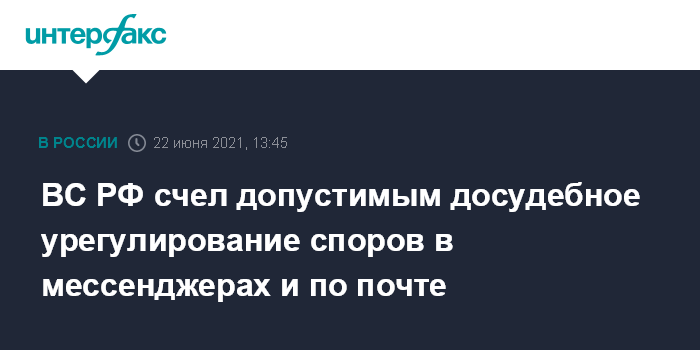 Москва. 22 июня. INTERFAX.RU - Сообщения в мессенджере, социальных сетях или в электронной почте достаточно для соблюдения досудебного порядка урегулирования спора, если такой способ переписки является обычной сложившейся деловой практикой для оппонентов, говорится в принятом во вторник постановлении пленума Верховного суда (ВС) РФ.