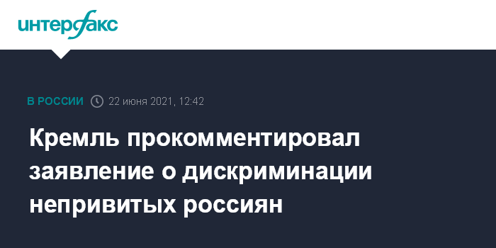"Мы видели это заявление. Безусловно, это повод для рассмотрения в оперативном штабе (по борьбе с коронавирусом - ИФ), но ситуация такова, что она требует энергичных мер. И поведение вируса настолько нестандартное, что так или иначе те, кто не привиты и те, кто не имеет антител, то есть не имеет иммунитета, - эти люди так или иначе попадут в менее выгодное положение, чем те, кто имеет иммунитет, либо переболев, либо сделав прививку. Это та реальность, в которой мы живем и с ней придется жить в обозримой перспективе", - сказал Песков журналистам во вторник.