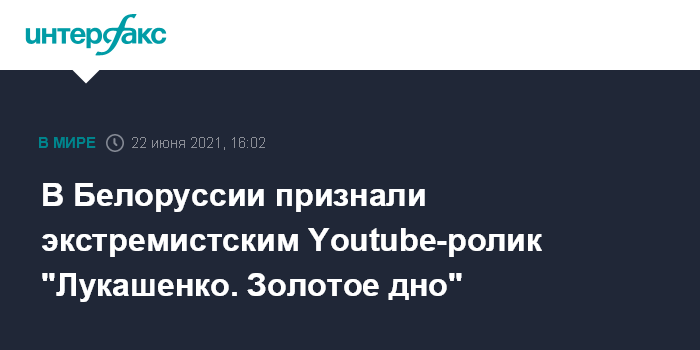Москва. 22 июня. INTERFAX.RU - Youtube-видеоролик с названием "Лукашенко. Золотое дно" внесен в республиканский список экстремистских материалов, который размещен на сайте Министерства информации Белоруссии.
