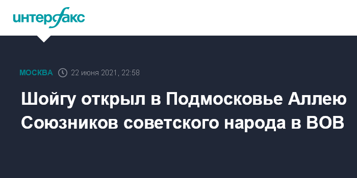 Москва. 22 июня. INTERFAX.RU - Министр обороны России Сергей Шойгу в подмосковной Кубинке во вторник принял участие в церемонии открытия Аллеи Союзников советского народа в Великой Отечественной войне.