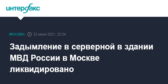 Москва. 22 июня. INTERFAX.RU - Задымление в серверной в здании МВД России в Москве ликвидировано, сообщили в пресс-центре министерства.