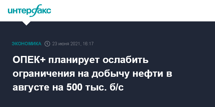 Москва. 23 июня. INTERFAX.RU - Страны ОПЕК+ обсуждают возможность ослабления ограничений на добычу нефти в августе на 500 тысяч баррелей в сутки (б/с), сообщает Dow Jones со ссылкой на источники.