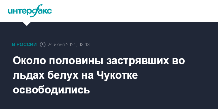 Москва. 24 июня. INTERFAX.RU - Часть белух, застрявших зимой в полынье на Чукотке, после таяния льда смогли освободиться из ледового плена, сообщает в четверг пресс-служба национального парка "Берингия".
