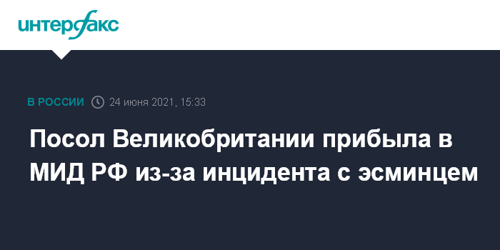Москва. 24 июня. INTERFAX.RU - Посол Великобритании Дебора Броннерт прибыла в МИД России, куда была вызвана в связи с имевшим место накануне инцидентом с британским эсминцем Defender в Черном море, передает корреспондент "Интерфакса".