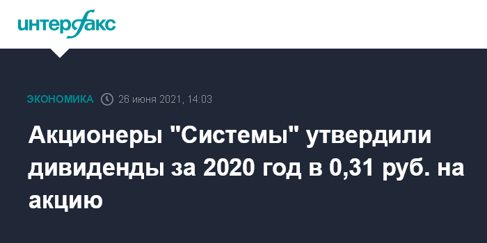 Москва. 26 июня. INTERFAX.RU - Акционеры ПАО АФК "Система" утвердили дивиденды по итогам деятельности за 2020 год в 0,31 рубля на акцию (6,2 рубля на одну ГДР), сообщила заместитель председателя совета директоров корпорации Анна Белова в ходе онлайн-трансляции.