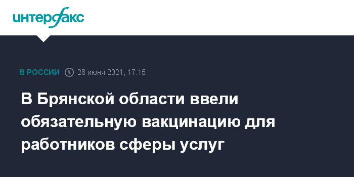 Москва. 26 июня. INTERFAX.RU - Главный санитарный врач Брянской области Людмила Трапезникова подписала постановление об обязательной вакцинации от коронавируса некоторых категорий граждан, сообщает пресс-служба правительства региона в субботу.
