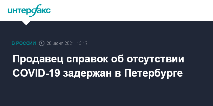 Москва. 28 июня. INTERFAX.RU - Подозреваемый в торговле поддельными справками об отрицательном тесте на COVID-19 задержан в Калининском районе Петербурга, сообщает в понедельник пресс-служба регионального главка МВД.