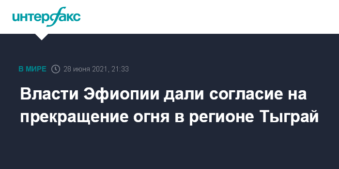 Москва. 28 июня. INTERFAX.RU - Правительство Эфиопии согласилось с предложением немедленно и в одностороннем порядке ввести режим прекращения огня в регионе Тыграй, где уже примерно восемь месяцев продолжаются боевые действия с повстанцами, передает агентство Associated Press (AP).
