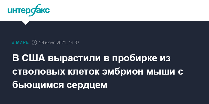 Москва. 29 июня. INTERFAX.RU - Ученые Медицинской школы университета Вирджинии сумели вырастить из эмбриональных стволовых клеток мышиный эмбрион с бьющимся сердцем.