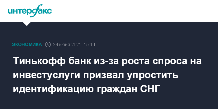 Москва. 29 июня. INTERFAX.RU - Тинькофф банк видит спрос на инвестиционные услуги в России со стороны граждан СНГ и предлагает ввести для них упрощенную идентификацию или упрощенный порядок открытия брокерского счета.