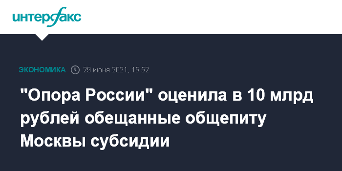 Москва. 29 июня. INTERFAX.RU - Меры антикризисной поддержки московского общепита обойдутся бюджету города более чем в 10 млрд рублей, заявил телеканалу "Россия-24" президент общероссийской общественной организации малого и среднего предпринимательства "Опора России" Александр Калинин.