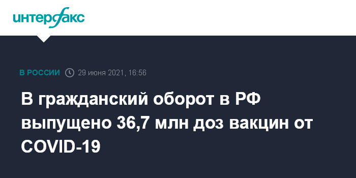 Москва. 29 июня. INTERFAX.RU - В России в гражданский оборот выпущено 36,7 млн доз вакцин от коронавируса, сказал глава Минпромторга Денис Мантуров.