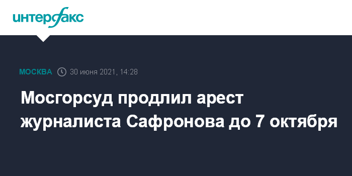 Москва. 30 июня. INTERFAX.RU - Московский городской суд удовлетворил ходатайство следствия о продлении срока содержания под стражей журналисту Ивану Сафронову, обвиняемому в государственной измене.