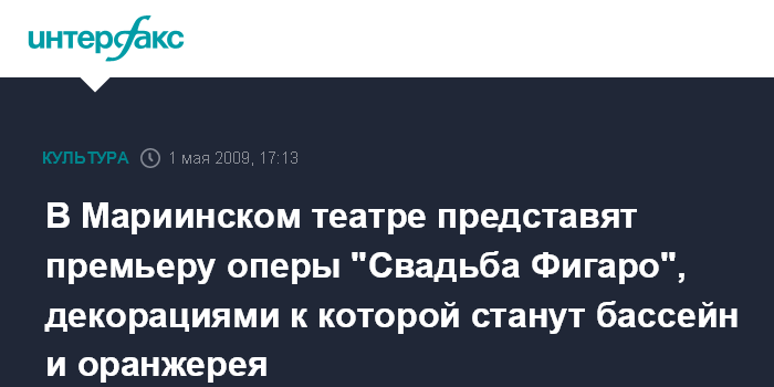 Москва. 1 мая. INTERFAX.RU - В Мариинском театре в субботу состоится премьера оперы Моцарта "Свадьба Фигаро" на русском языке. Как сообщает пресс-служба театра, среди элементов сценографического оформления постановки зрители увидят бассейн, качели, оранжерею и много других необычных деталей.