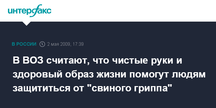 Москва. 2 мая. INTERFAX.RU – Чтобы защитить себя от вируса гриппа свиней типа А(H1N1) Всемирная организация здравоохранения рекомендует вести здоровый образ жизни, избегать контактов с больными и тщательно мыть руки.