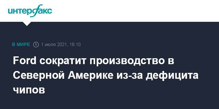 Москва. 1 июля. INTERFAX.RU - Американский автопроизводитель Ford Motor в июле будет вынужден приостановить или ограничить производство автомобилей на восьми заводах в Северной Америке из-за дефицита полупроводниковых компонентов, пишет The Wall Street Journal.