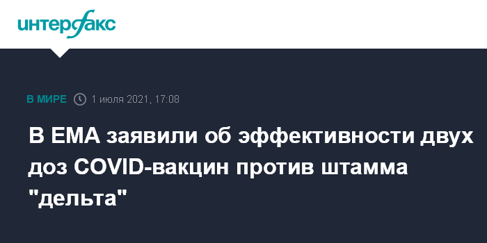 Москва. 1 июля. INTERFAX.RU - Вакцины от COVID-19, при введении обеих их доз, срабатывают на штамме "дельта" коронавируса, заявил в четверг глава отдела стратегии вакцинации Европейского агентства лекарственных средств (EMA) Марко Кавальери.
