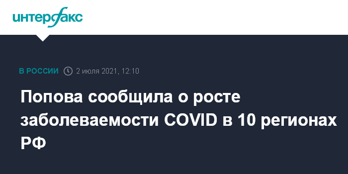 Москва. 2 июля. INTERFAX.RU - Подъем заболеваемости коронавирусом COVID-19 идет в 10 регионах, в более чем половине он замедляется, а есть еще целый ряд субъектов РФ, в которых ситуацию можно назвать стабильной, сказала глава Роспотребнадзора Анна Попова.