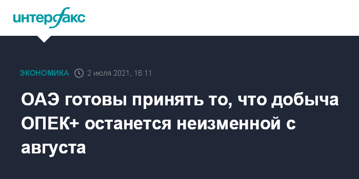 Москва. 2 июля. INTERFAX.RU - ОАЭ готовы принять то, что уровни добычи ОПЕК+ останутся неизменными с августа, если новые договоренности о наращивании добычи не будут достигнуты, пишет агентство Bloomberg со ссылкой на делегата.
