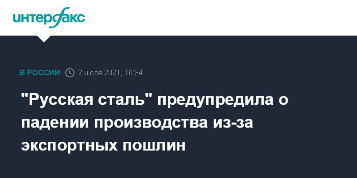 Москва. 2 июля. INTERFAX.RU - Введение экспортных пошлин на металлы может привести к сокращению производства стального проката и чугуна за 5 месяцев на 1,2 млн тонн при условии сохранения текущей рыночной конъюнктуры, предупредила ассоциация металлургических компаний "Русская сталь".
