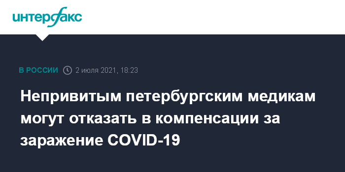 Москва. 2 июля. INTERFAX.RU - В Петербурге могут принять постановление, по которому медики, заразившиеся коронавирусом при исполнении обязанностей, не смогут получить за это компенсации, если не были привиты. Проект документа появился на сайте городского правительства.
