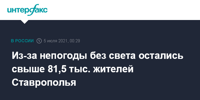 Ранее сообщалось, что в результате сильного дождя и порывов ветра произошло отключение электроснабжения в городе Ставрополе (2427 человек) и селе Надежда Шпаковского округа (6631 человек).