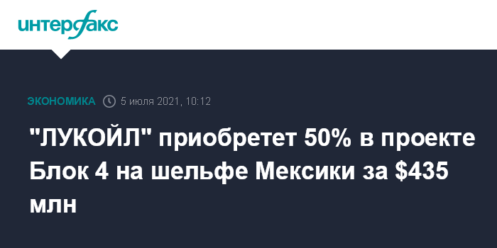 Москва. 5 июля. INTERFAX.RU - "ЛУКОЙЛ" заключил соглашение о приобретении 50%-ной операторской доли участия в проекте Блок 4 в Мексике путем покупки холдинговой компании, владеющей компанией-оператором.