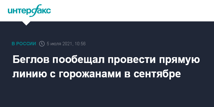 30 июня Путин рекомендовал губернаторам проводить прямые линии для жителей регионов. В тот же день Беглов сообщил, что, руководствуясь поручением президента, уже в ближайшем выпуске ежемесячной программы "Петербург. Новый взгляд. Разговор с Александром Бегловым" на телеканале "78" он будет принимать в эфир звонки горожан.