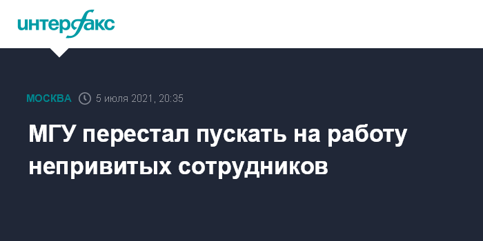 Москва. 5 июля. INTERFAX.RU - Московский государственный университет с 5 июля перестал пускать на рабочие места сотрудников, которые не прошли вакцинацию от COVID-19 при отсутствии противопоказаний и не переболели.