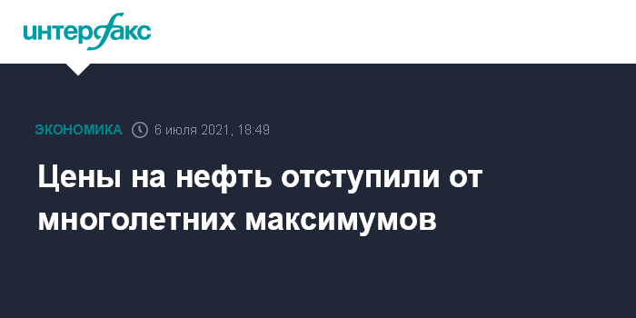 Москва. 6 июля. INTERFAX.RU - Цены на нефть перешли к снижению в ходе торгов во вторник, отступив от многолетних максимумов, которых они достигли накануне на фоне сообщений о том, что встреча министров ОПЕК+ была отложена.