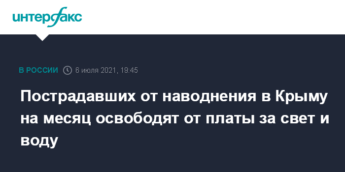 Москва. 6 июля. INTERFAX.RU - Жителей Крыма, которые пострадали от подтоплений после сильных ливней, на месяц - по 31 июля - освободят от платы за коммунальные услуги: свет и воду, сообщил глава республики Сергей Аксенов.